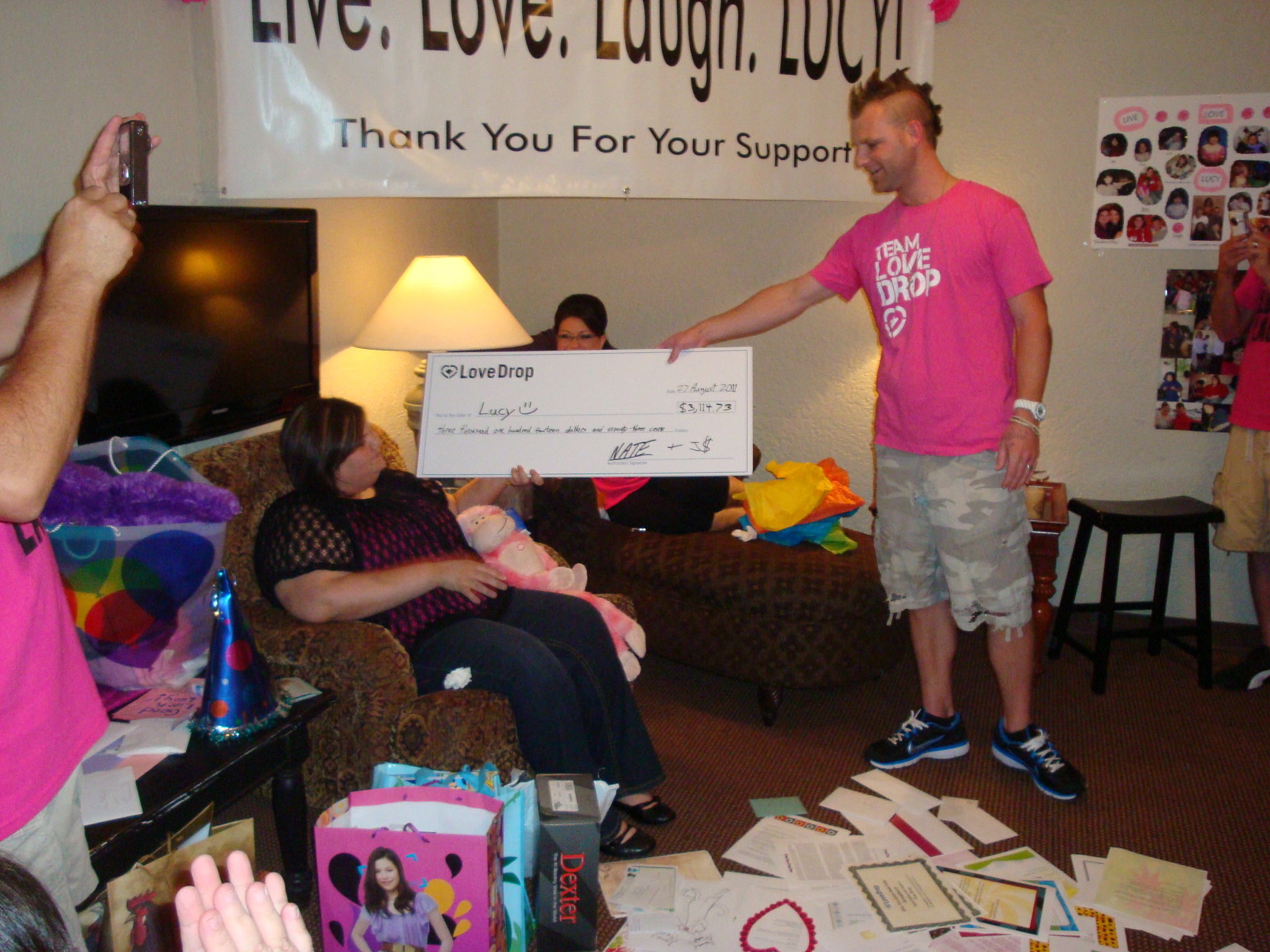 J$ presents Lucy with generous Love Drop check. *applause*