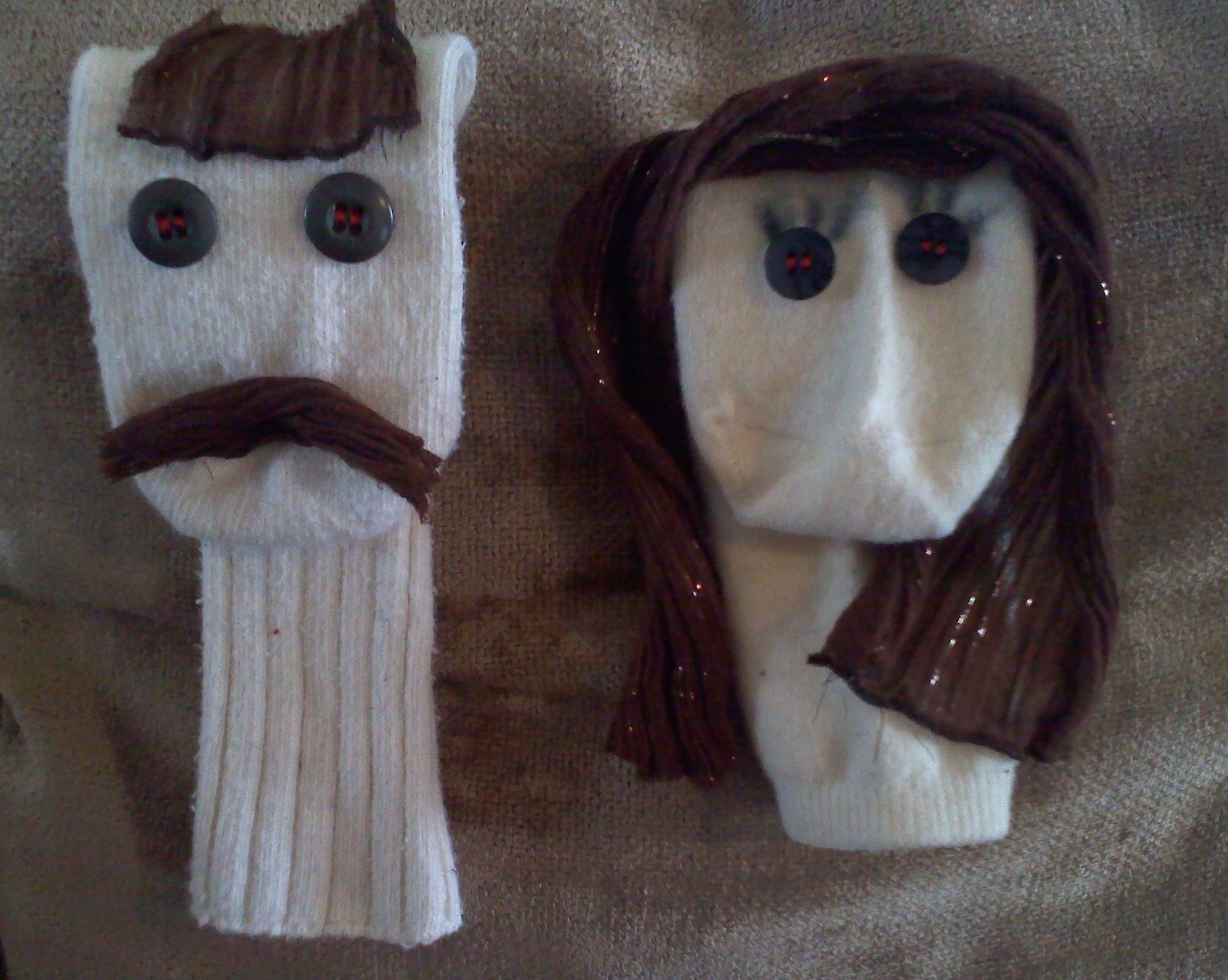 Socko with his Donald Trump hairdo and fantastic moustache. Socka with her long flowing hair. Our first sock puppet effort. I think, success!