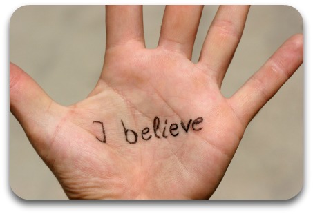 The words “I believe” written on a palm