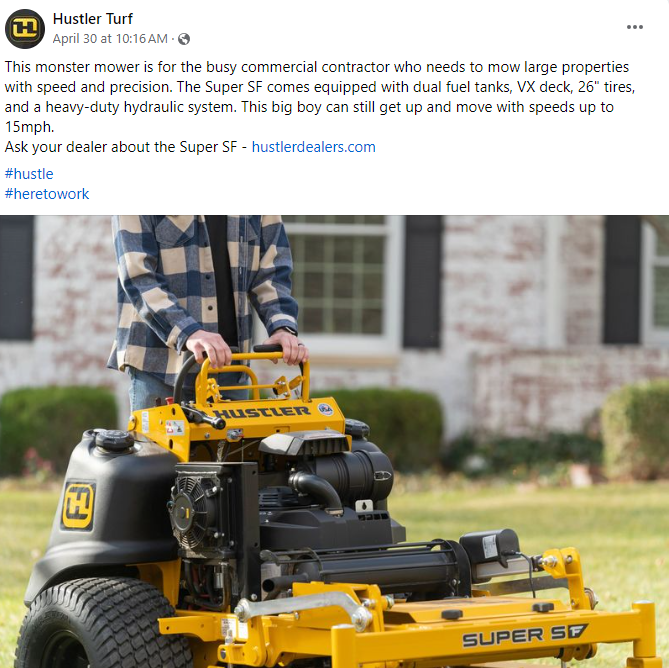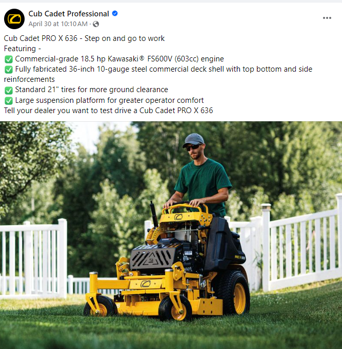 2022/2024 – Managed social media content for Hustler Turf, Cub Cadet PRO, and Troy-Bilt – Following are links to organic posts I created for Facebook and Instagram.