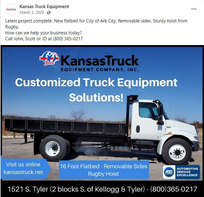 2018 – 2020 – Managed social media content for Kansas Truck Equipment including original content/photos/light graphic design and monitored for community questions and comments.